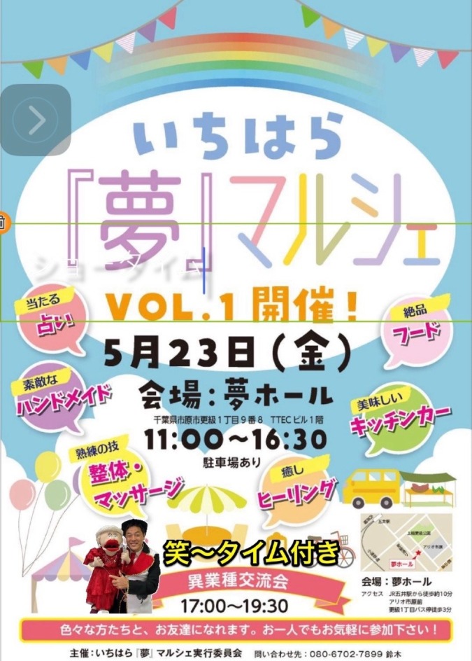 市原市のマルシェにいらっしゃいませんか いろいろな業種のお店が出店いたします マルシェ終了後の交流会で ハッピーマウス KAZUの腹話術マジックショーやらせていただけることになりました お時間ある方はぜひ遊びに来てください 報告する Post Share コメント この記事へのコメントはありません。 コメントするためには、 ログイン してください。