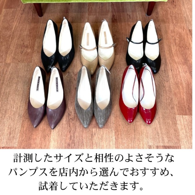 足のサイズ計測 → どんなパンプスを選んだらいいのかアドバイス→上級シューフィッターおすすめのパンプスの試着 → 履き比べ
