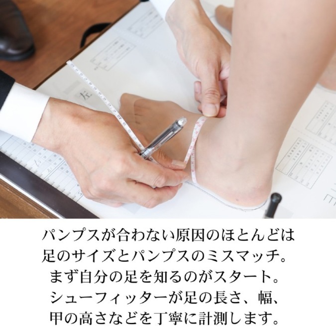 そんな常識を変えるためにプロのシューフィッターがあなたの足を丁寧に計測して、一日中やさしく支えるカスタムメイドパンプスをお届けします。